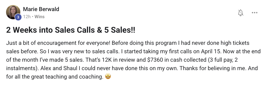 Marie generated over $12,000 in revenue from $900 in ad spend after just 5 weeks in the program.