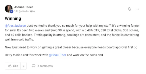 *These results are exceptional and not typical. Alex Jackson, Shaul Tsor & their clients are professional marketers with years of experience. The average person who works with us and runs ads for 60 days to this funnel books 102 sales calls. Your results will vary depending on many factors, including your ability to close the leads, skill, experience, niche, effort and more.